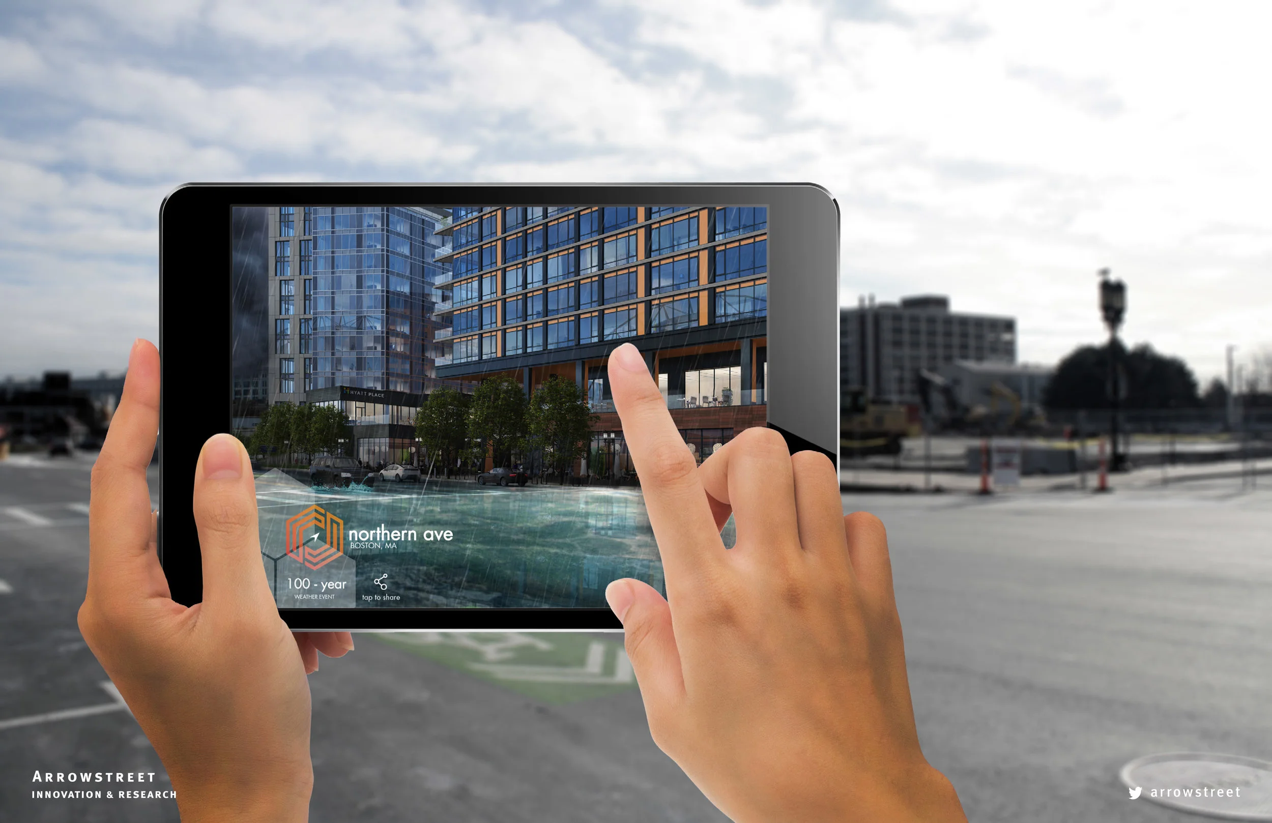 This augmented reality experience depicts the potential impact of sea level rise on one of Arrowstreet's residential projects in the Seaport. The experience highlights resilient building features that protect the structure from flood damage.